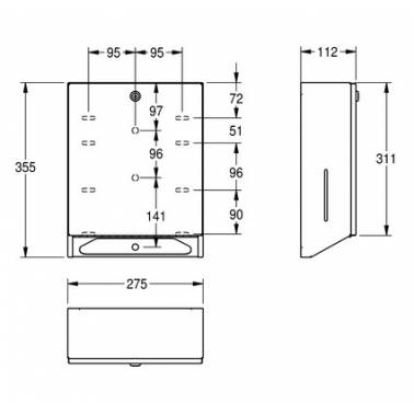 Distribuidor de papel toalha de parede feito de aço inoxidável com acabamento acetinado modelo RODAN da marca Franke. Possui tampa frontal com janelas de inspeção nas laterais para controle do consumo, fechadura de cilindro com chave Franke padrão, espessura de 0,8 mm. Tem uma capacidade aproximada de 500 a 800 toalhas dependendo da sua dobra. Inclui parafusos e plugues de aço inoxidável. Suas dimensões são 275x355x112 mm (AxAxP).