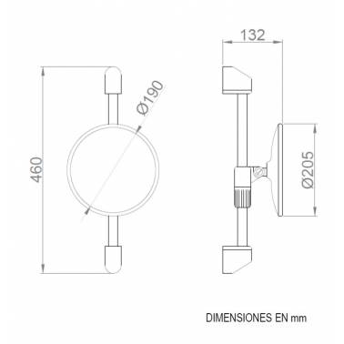 Espelho de aumento ajustável em altura Nofer. É feito de ABS cromado. É instalado na parede com dois pontos de fixação onde ficam ocultos os parafusos de fixação. Possui uma barra vertical onde o espelho é ajustado para cima ou para baixo. Suas dimensões são 460x205x132mm (Altura x Largura x Profundidade) o espelho tem um diâmetro de Ø190mm.