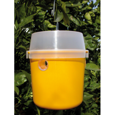 Exterminador de insectos Tephri Trap de Fricosmos con dimensiones de 155 mm de altura, 125 mm de diámetro y un peso de 0,14 kg. Este atrapador de insectos es versátil y efectivo, con cuatro agujeros que mejoran el flujo de los atrayentes. Puede operar tanto en seco con parches atrayentes como en húmedo con proteínas hidrolizadas. Con una capacidad de 400 cc, es ideal para usar en exteriores para controlar insectos de manera eficiente.
