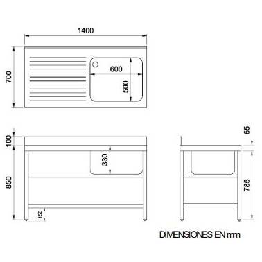 Pia industrial em aço inox AISI 304 com acabamento acetinado com moldura e prateleira, pia e escorredor nas medidas 1400x700 Nofer. O escorredor pode ficar à direita ou à esquerda (muito importante para indicar a lateral do escorredor no final do pedido). Existem vários tamanhos disponíveis com a estrutura de 700 mm, 1000, 1200, 1300, 400, 1600, 1800 ou 2000 mm. É construído com um material durável e resistente à corrosão. Adequado para instalações profissionais com alta frequência de uso. Bandeja profunda com proteção anti-ruído. Inclui válvula de descarga e drenagem. 65mm na frente em ponto redondo. Babador traseiro de 100 mm. Estrutura com 4 pés tubulares de 40x40mm com plug ajustável em altura de 850mm com rosca oculta. A montagem é feita por meio de parafusos Allen (A chave está incluída). As pernas são extensíveis, até 900mm de altura, as traseiras avançadas que permitem a sua colocação em pisos com raio sanitário. Suas dimensões são 1400x700mm e as dimensões do balde são 600x500x330mm