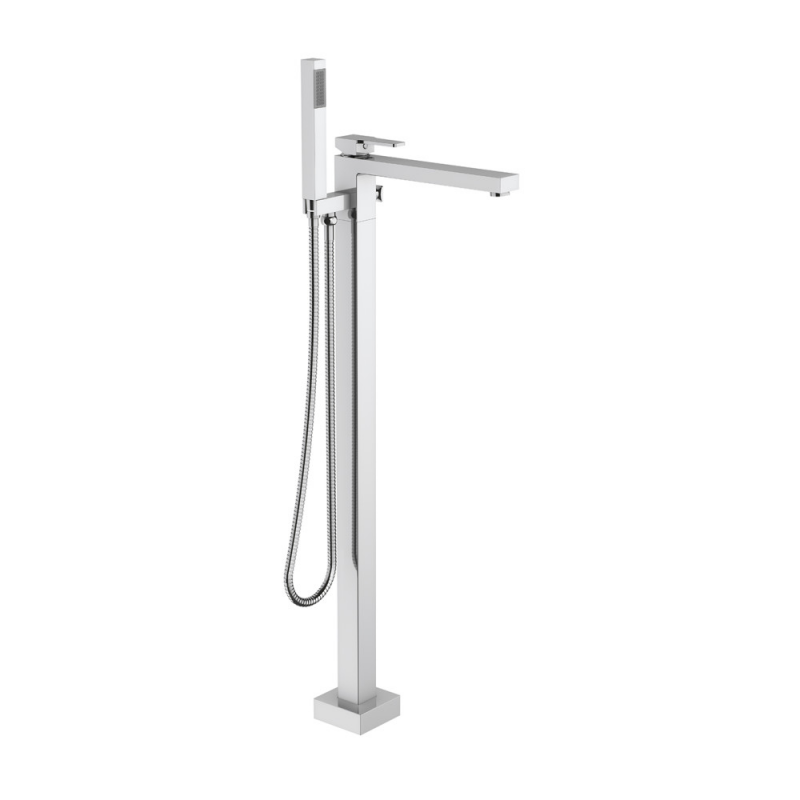 Monomando mezclador de pie para bañera exenta con sistema de regulación para instalar perpendicular y alineado perfectamente con la bañera. Cartucho cerámico D40 convencional. Provisto de un aireador plástico antical con casquillo de latón cromado. Suministrado con conexiones flexibles desde la base hasta el monomando. Incluye todos los elementos de fijación.