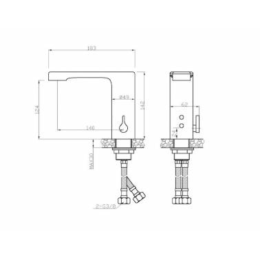 Grifo electrónico mezclador de lavabo para colocar sobre encimera Nofer. El cuerpo del grifo está fabricado en latón cromado, los componentes están fabricados en plásticos cromados bajo norma EN248. Construcción robusta y antivandálica. Dos aguas. Caudal de 3 bar, 6l/min. La temperatura de trabajo es de 1 a 80ºC, la temperatura máxima recomendada es 60ºC. Presión de trabajo entre 0’5 a 6 bar. Para que el grifo funcione se deben colocar las manos bajo el rociador, este se activará automáticamente cuando el sensor infrarrojos detecte movimiento, mientras las manos permanezcan dentro del campo del sensor caerá el agua y se apagará unos segundos después de retirarlas. Tiene un rango de detección entre 12 a 18cm. Funciona mediante conexión a red eléctrica ½”G utilizando cuatro pilas doble A que proporcionarán 6V como apoyo de seguridad por si se produce un corte de corriente. AC 220 – 50/60Hz / DC6V (Cuatro pilas AA). Consumo en stand by: <0,5 mW. Caño fijo. Incluye un filtro plástico antipartículas y conexiones de tubos flexibles TUCAI de 400mm incluidos 3/8”G. Apto para zonas comunes con alta frecuencia de uso. Cumple con las Directivas Europeas de Seguridad Eléctrica 2014/35/UE, Compatibilidad Electromagnética EMC 2014/30/EU y Productos de la Construcción 305/2011UE según las normas EN817:2008 y EN 15091:2013. Certificado CE. Sus dimensiones son 142mm de alto, 62mm de ancho y 183mm de profundidad. Fabricado por Nofer.