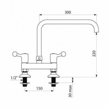 Torneira misturadora de dois furos com vazão de 60 litros por minuto, com bica giratória de Ø22 e comprimento de 300 mm, da marca Delabie. Ideal para aplicações que exigem uma torneira de dois furos com bica giratória mais longa.