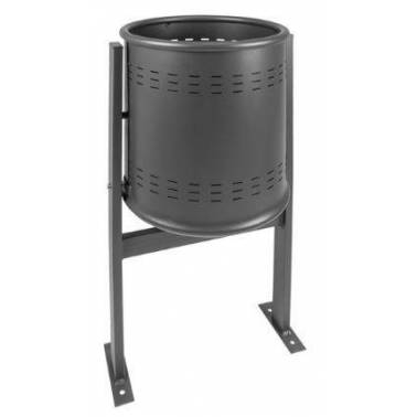 Lixeira metálica perfurada para exterior com suporte para ancoragem ao solo e mecanismo de descarga dobrável. Capacidade: 42 litros. Peso: 8,75kg.