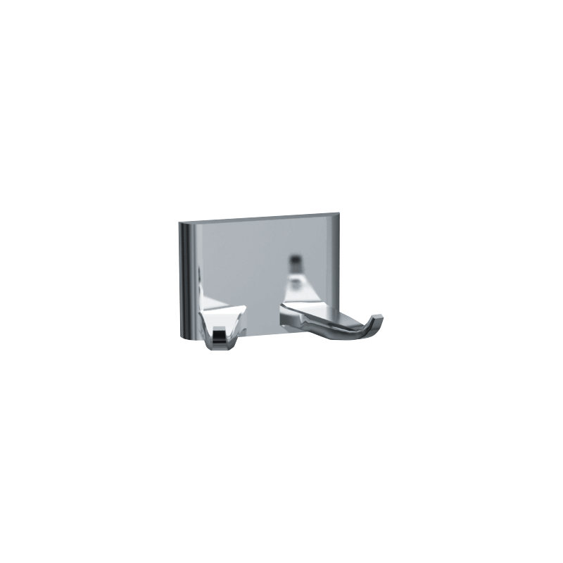 Gancho cuadrado para bata doble, diseñado para montaje en superficie y fabricado en zamak cromado de alta resistencia con un recubrimiento de triple cromo que proporciona una excelente durabilidad y protección contra la corrosión. Cuenta con un diseño de gancho doble para una mayor funcionalidad, permitiendo colgar dos prendas simultáneamente. Se incluye un tornillo de fijación ranurado de acero inoxidable a lo largo del perímetro de la brida para una instalación firme y segura en el soporte de pared de acero inoxidable. Este soporte incorpora dos refuerzos verticales en relieve que aumentan la resistencia estructural y estabilidad del gancho. Ideal para baños, vestuarios y espacios comerciales donde se requiere una solución práctica y elegante. Dimensiones totales: 2-3/16" x 1-7/16" x 1-29/64" (56 x 37 x 37 mm).