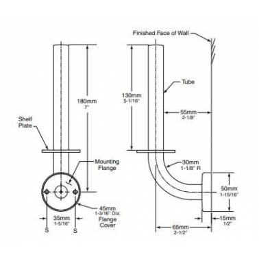 Porta-rolos de reserva em aço inoxidável polido polido Bobrick . A flange oculta a placa de instalação e oferece um encaixe perfeito na parede. O dispensador de papel comporta um rolo de até 127 mm de diâmetro. Suas dimensões são 19 mm de diâmetro, 205 mm de altura e 75 mm de projeção na superfície da parede.