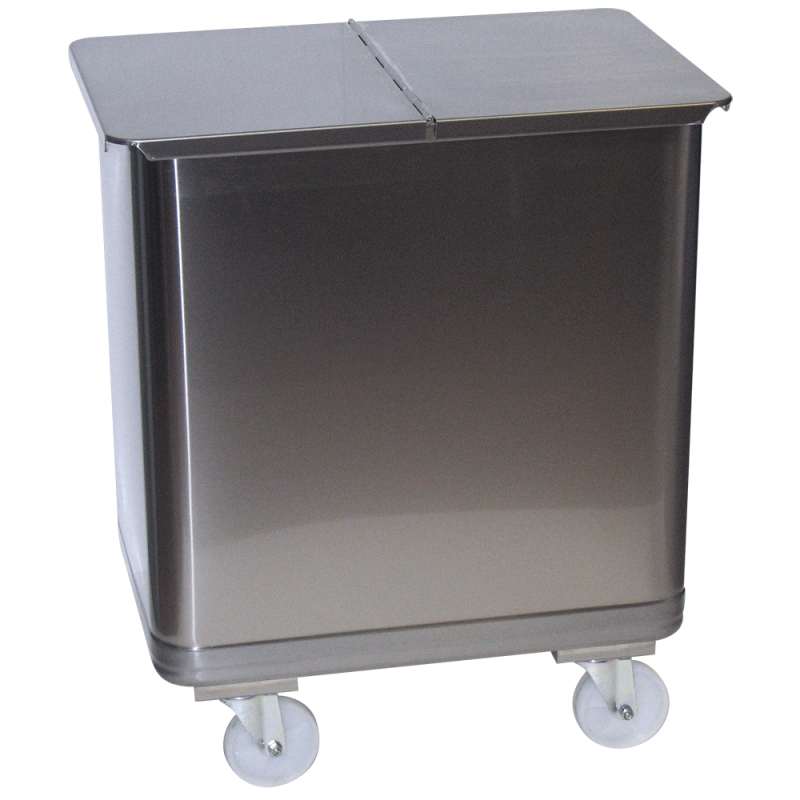 Recipiente feito de aço inoxidável com tampa e rodas especiais para padaria