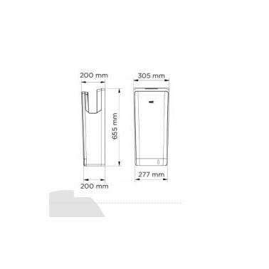 O secador de mãos a ar pressurizado consiste em um corpo de ABS compacto de 3 mm de espessura que é preso à parede usando uma estrutura de aço carbono com acabamento em prata. A referida moldura possui uma abertura de 62x127 mm para poder fazer a ligação elétrica do aparelho pela parte traseira do mesmo. A moldura é fixada na parede com 6 furos e diâmetro de broca de 8 mm. O secador é ativado por um sensor infravermelho eletrônico e desliga automaticamente após as mãos serem removidas do campo do sensor ou após 25 s. A saída do ar é realizada por meio de uma matriz de orifícios lineares que permite uma ótima distribuição do ar e uma secagem por arraste da água, a temperatura do ar é controlada eletronicamente. Para facilitar o acesso ao secador, a abertura superior está sempre iluminada. O motor é do tipo universal com escovas, 750W-230V, 20.000 rpm.A velocidade de saída do ar é de 95 m / s o que permite a secagem das mãos em 7 s. aproximadamente. O secador tem uma potência total de 2.050W a 240V. O nível de som a 2 metros é de 70 dB.