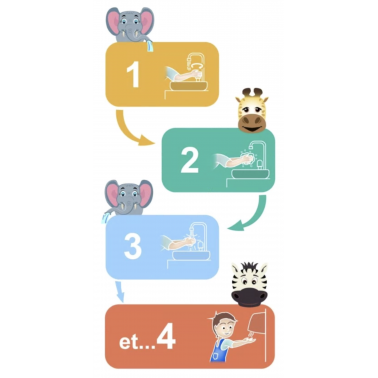 Secador de mãos infantil com dispensador de sabonete e pratos Sup'Air Kids modelo JVD. O tempo de secagem é de 10 a 15 segundos com alto fluxo. A potência nominal é 800W, a fonte de alimentação é 230V / 50Hz. A caixa é feita de alumínio anti-vandalismo na cor branca com desenho infantil. Nível de som 75 dB. Possui iluminação na área de secagem e tanque de coleta de água com capacidade de 600ml. CE - Classe II - IP24. Possui garantia de dois anos. Este secador de mãos inclui um filtro de cobre bactericida, Cleanline Gl Kids, um dispensador de sabonete infantil, uma placa de PVC com um elefante para colocar atrás da torneira medindo 200x200mm e uma placa de ensino para ajudar as crianças com ilustrações a lavar e seque as mãos, as medidas desta placa são 143x282mm. As dimensões do secador de mãos são 216x292x195mm (LxWxP)